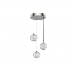 Polished nickel with meticulously cut spherical shades create glittering beams of illumination throughout the design.